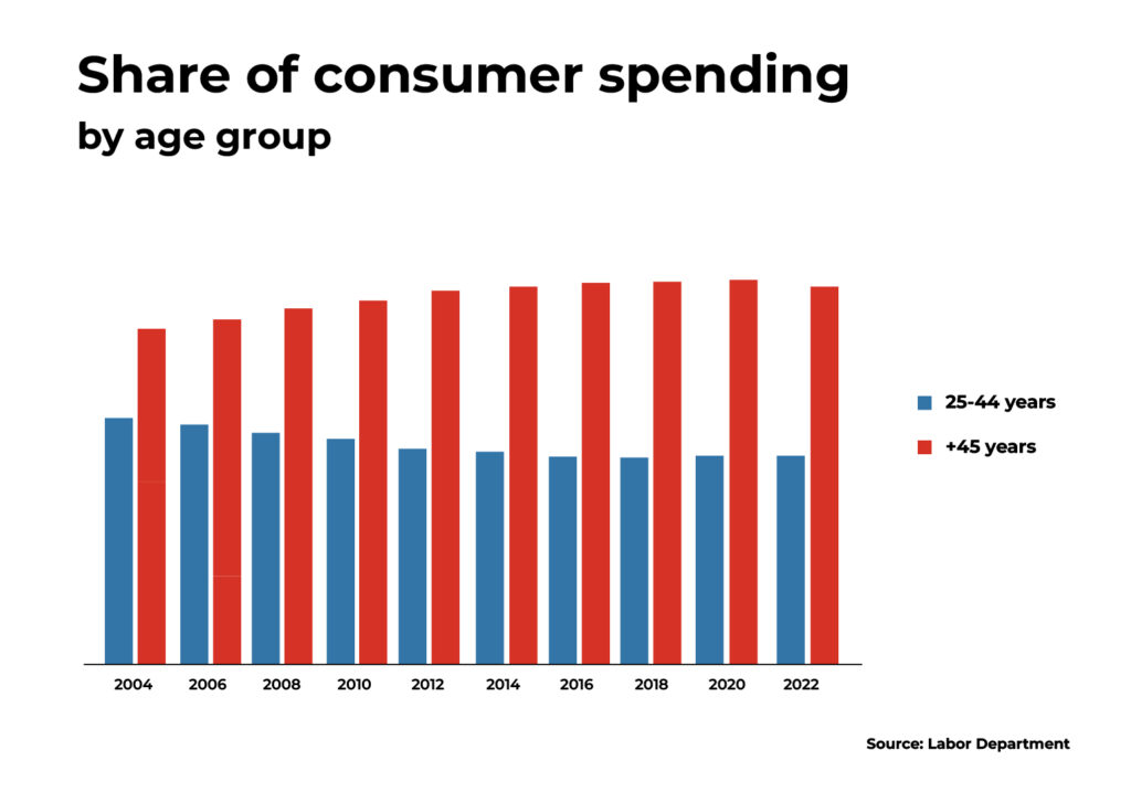 Younger people love Nikes. They just can’t afford them. The “silver economy” holds the purse strings. Over-45s have more disposable income, buy more frequently, and prioritize function over fashion.